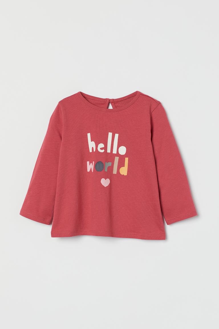Long-sleeved top in soft, printed cotton jersey with a round neckline and small opening with a button at the back of the neck.
